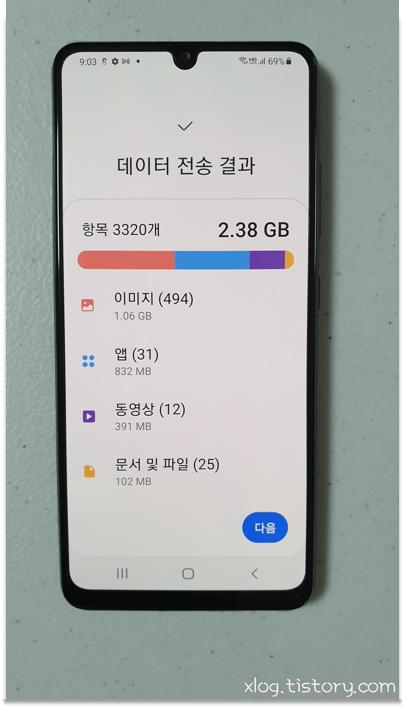 기존 폰에 있는 연락처, 문자, 설치 앱, 사진, 동영상 등을 새로 산 A32로 옮겼습니다.