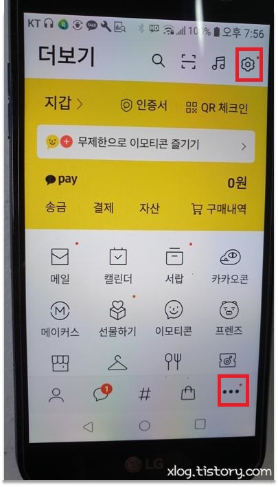 화면 아래쪽 점3개 아이콘을 누르고 위쪽에서 톱니바퀴 모양의 설정 아이콘을 누릅니다.