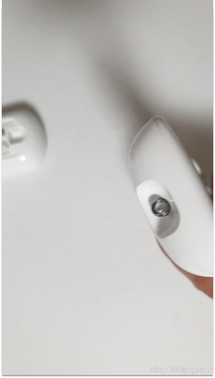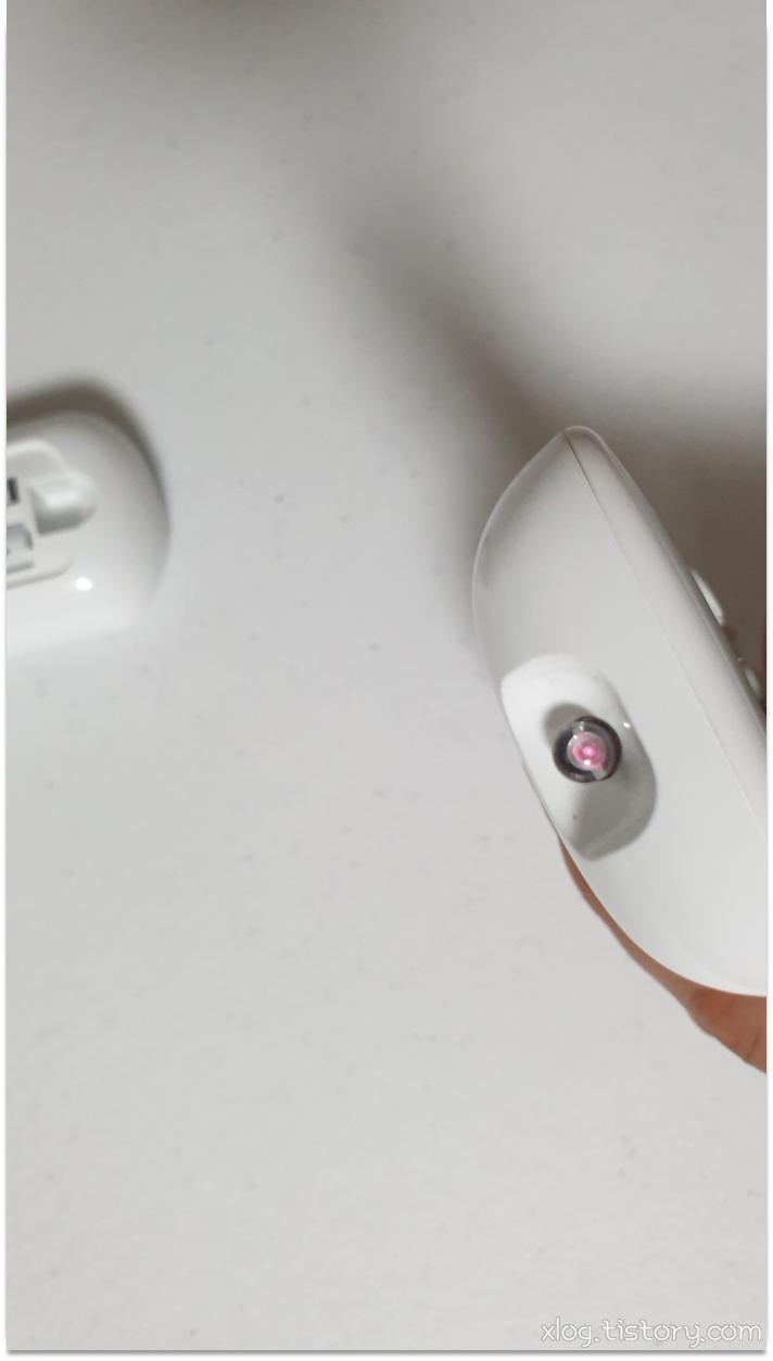 맨 눈으로는 확인하기 어렵고, 리모컨 버튼을 누를때 적외선 센서 부분을 스마트폰 카메라를 통해 보면 불빛을 확인할 수 있습니다.