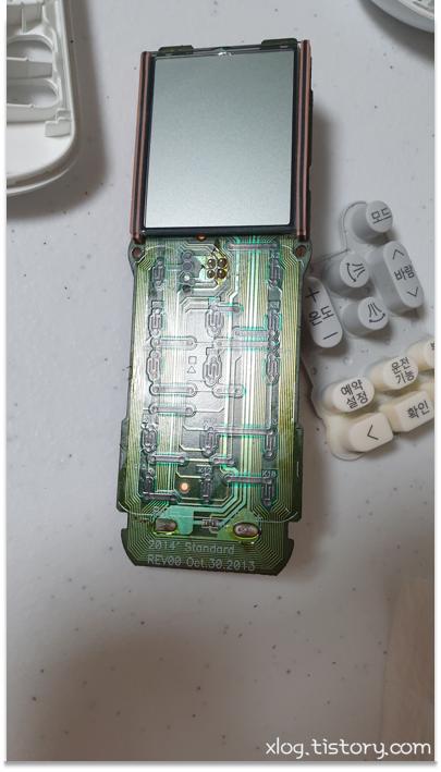 상판에 있는 갈색 기판을 돌려보면 액정과 버튼이 쏙 하고 빠집니다.