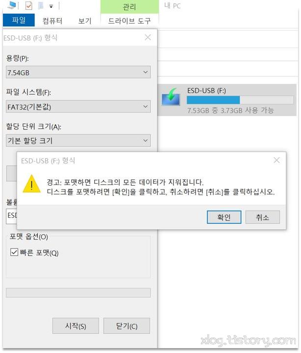 내컴퓨터 -> 해당 USB에서 마우스 오른쪽 -> 포맷을 선택하면 위와 같은 창이 뜨는데