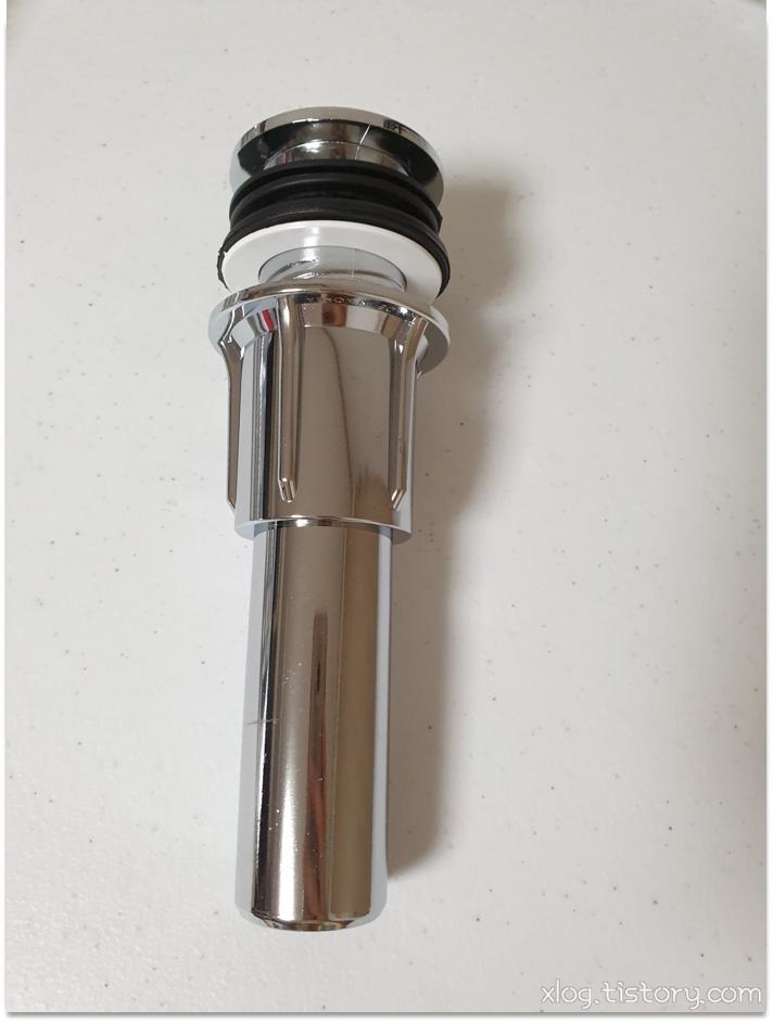 고무와 얇은 플라스틱 와셔(?)를 잘 고정시키지 않으면 물이 새므로 잘 고정해야하는데 너무 힘을 주면 재질이 플라스틱이라서 세면대 위쪽에 꼽은 상단부가 부러질 수 있으니 주의해야합니다.