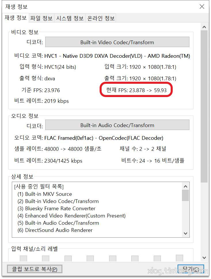 재생 화면에서 마우스 오른쪽 버튼 -> 재생 정보 또는 Ctrl + F1을 눌러 재생 정보 창을 띄우면 현재 재생중인 동영상에 플루이드 모션이 적용 되었는지 확인 할 수 있습니다.