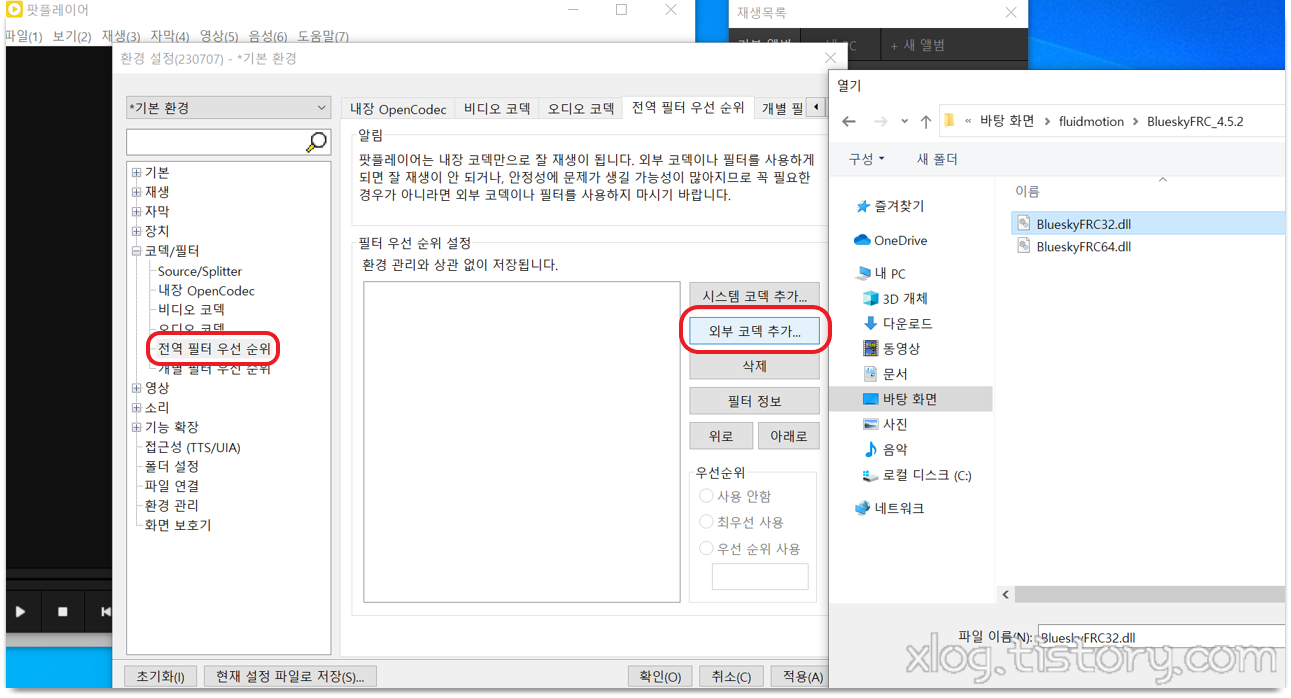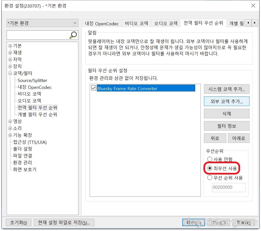 환경 설정창에서 [코덱/필터] 란에서 [전역 필터 우선 순위]를 선택하고 [외부 코덱 추가] 버튼을 누르면 파일 선택창이 뜨는데, 압축풀기 했던 Bluesky Frame Rate Converter 폴더로 이동해서 BlueskyFRC32.dll를 선택합니다.