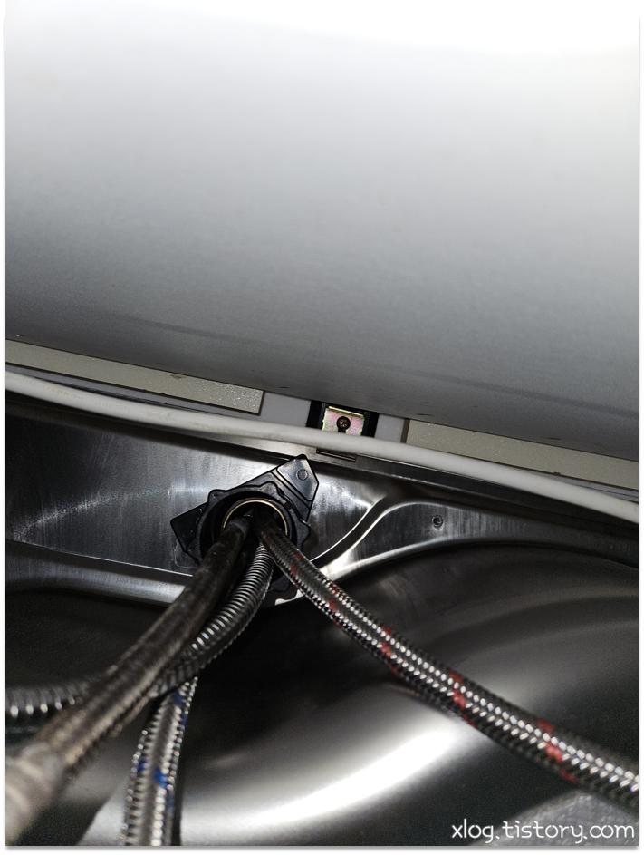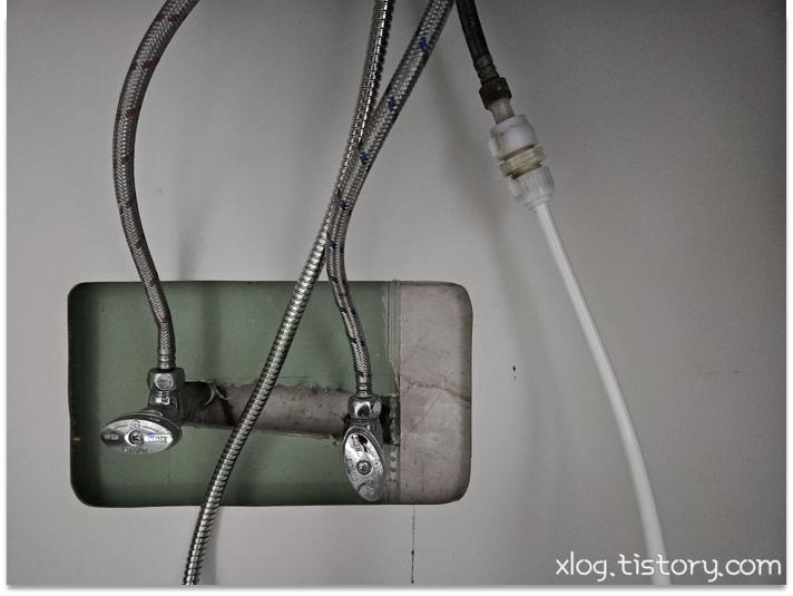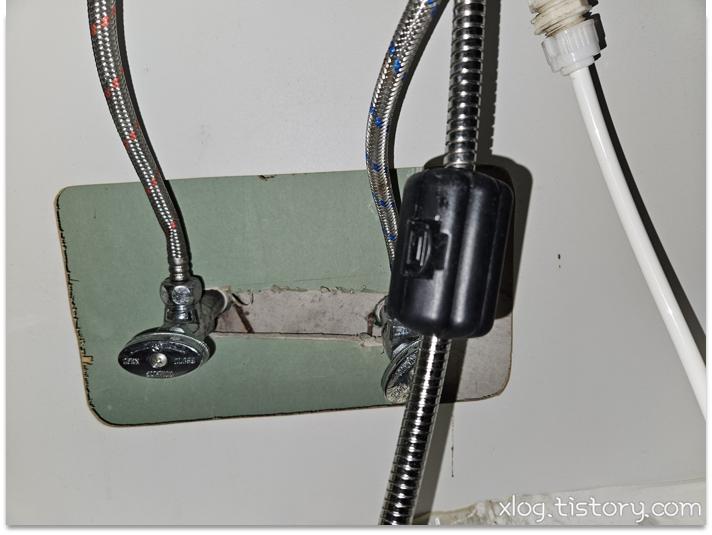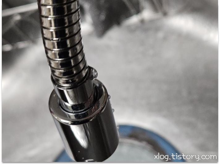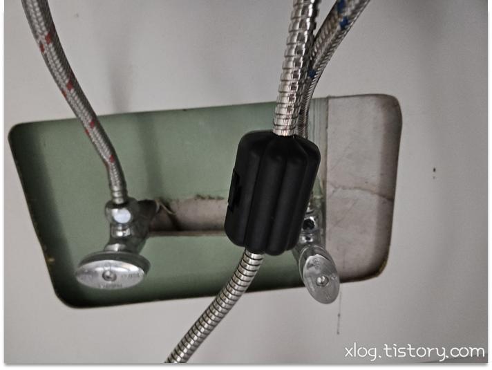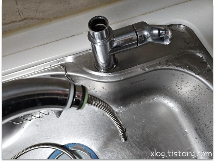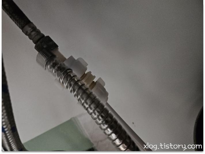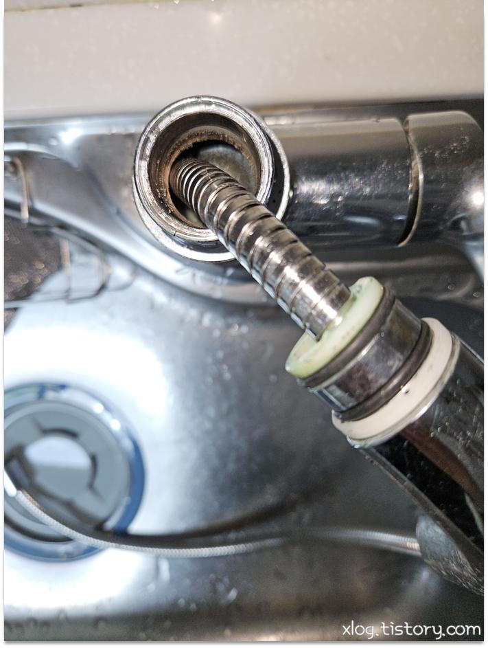 수전 아래쪽을 카메라에 플래시를 켜서 찍어보니 호스만 교체할 수 있는 모델인듯 했습니다.