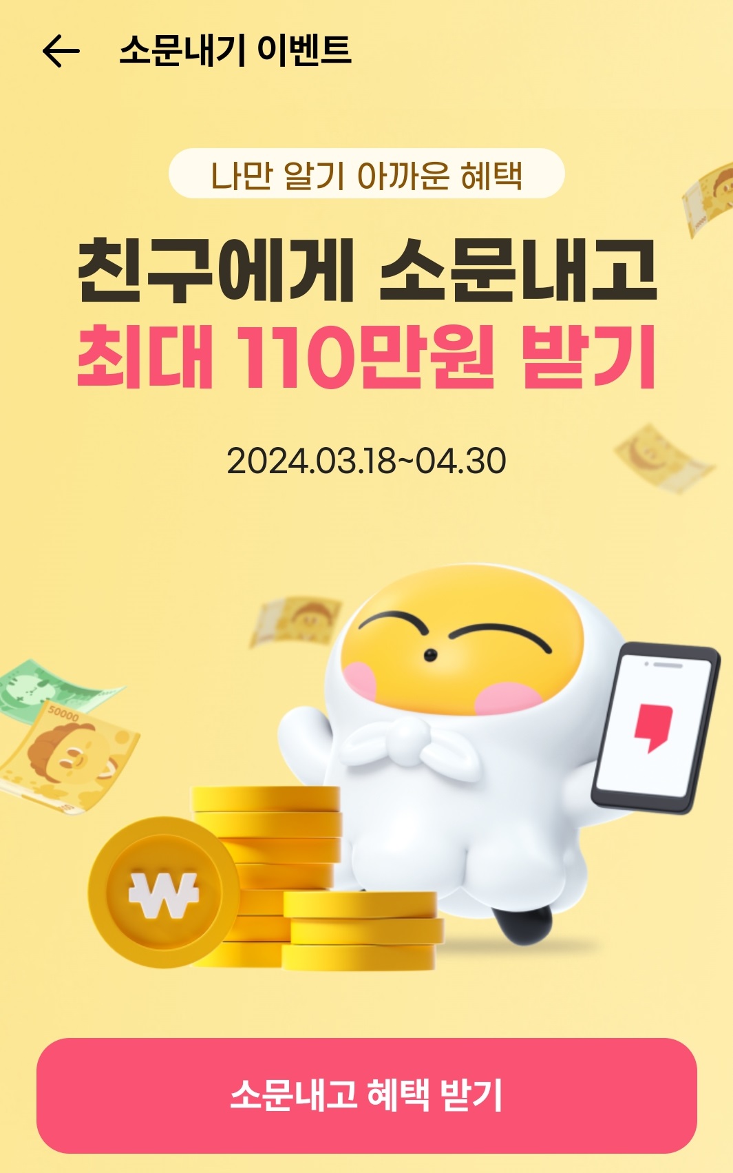 이벤트 기간은 24.03.18 ~ 24.04.30까지이고 아래의 링크를 통해서 신규 가입 할 경우 500원을 얻을 수 있다고 합니다.
