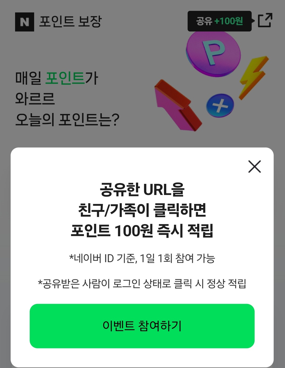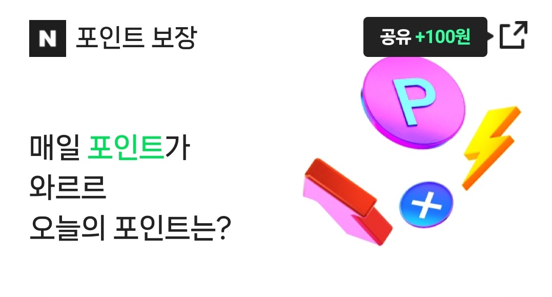 네이버페이에서 포인트 보장 페이지의 링크를 공유하고 친구나 지인이 클릭하면 링크 공유자에게 100포인트 주는 이벤트를 진행하고 있네요